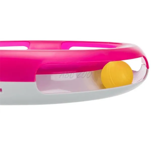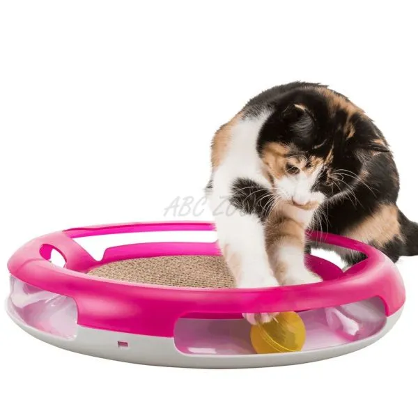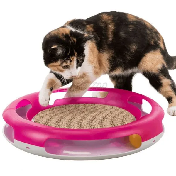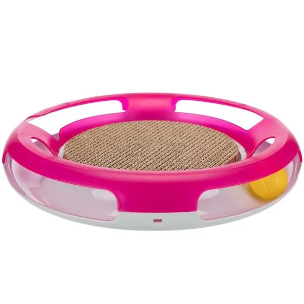 Trixie Race & Scratch este o jucărie interactivă în formă de cerc cu o minge și un punct de zgâriere în mijloc, pentru pisici.