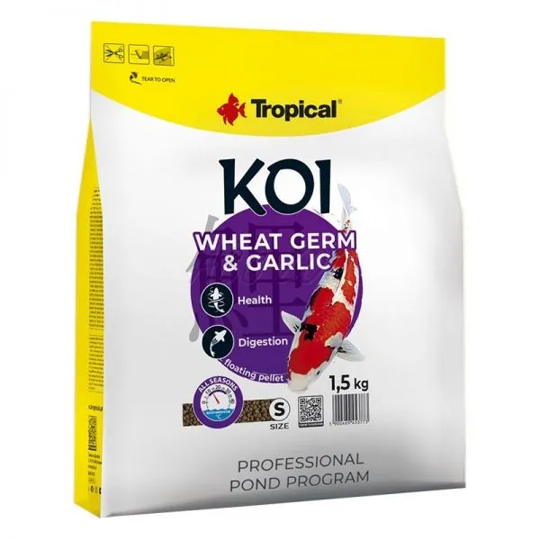 TROPICAL Koi Wheat Germ & Garlic Pellet - aliment premium cu germeni de grâu și usturoi sub formă de pelete flotante, pentru hrănirea zilnică a peștilor koi într-un interval larg de temperaturi ale apei (8 - 30°C)