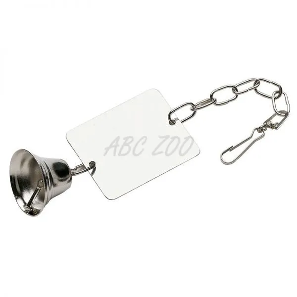 Jucăria pentru păsări cu oglindă este din metal și are un clopoțel și un lanț cu un cârlig pentru a o atașa la cușcă.