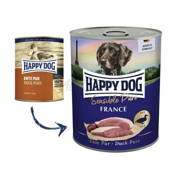 Happy Dog Ente Pur France este o conservă din carne de rață fără conținut vegetal, cu adaos de vitamine, pentru câini.