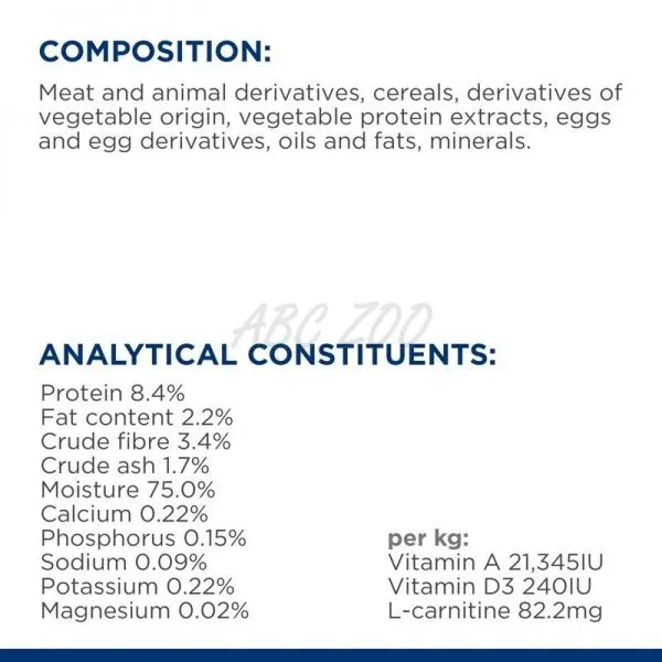 CONSTITUENȚI ANALITICI: Proteine 8,4%, grăsimi 2,2%, fibre brute 3,4%, cenușă brută 1,7%, umiditate 75,0%, calciu 0,22%, fosfor 0,15%, sodiu 0,09%, potasiu 0,22%, magneziu 0,02%; per kg: vitamina A 21 345 UI, vitamina D3 240 UI, L-carnitină 82,2 mg.