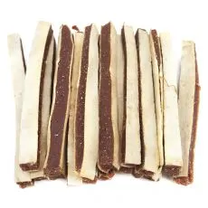 Hrană suplimentară pentru câini cu carne de vită și cod sub formă de fâșii lungi.