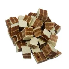 Hrană suplimentară pentru câini şi pisici, sub formă de cubuleţe de carne de pui şi cod.