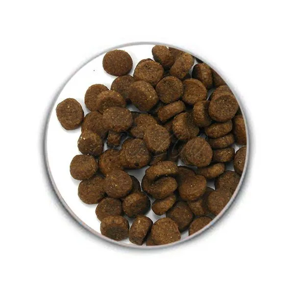 Valori analitice: proteine 42%, grăsimi 18%, fibre 3%, umiditate 10%, zinc 120mg/kg, seleniu 0,4mg/kg, vitamină E 150IU/kg, taurină 0,15%, acizi grași omega-6 2,8%, acizi grași omega-3 0,3%.