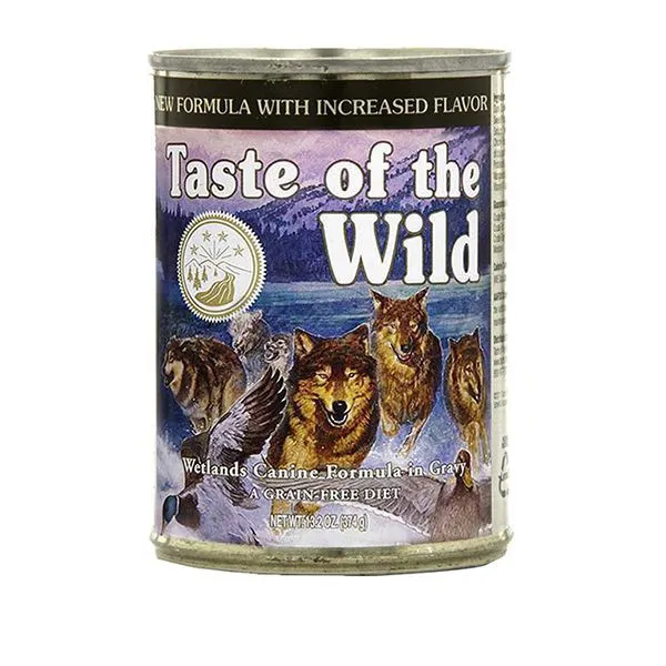 TASTE OF THE WILD Wetlands   este o hrană completă, conservată, potrivită pentru câinii adulți de toate rasele. Acest brand de produse alimentare este foarte apreciat de departamentul de analiză a calității a Institutului Dog Food Analysis .