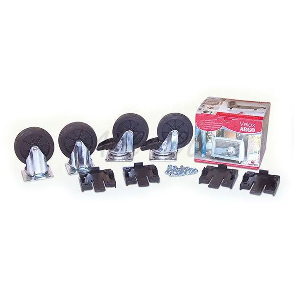 Setul de roți Velox ARGO permite transportul rapid al cuștii. Setul include 2 roți pivotante, cu piedică pentru partea din față și 2 roți fixe, pentru partea din spate. Ușor de montat, fără a fi necesară utilizarea de instrumente speciale.