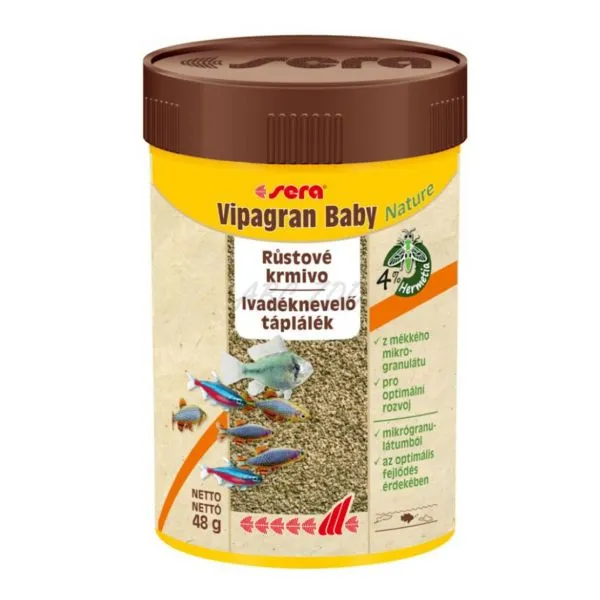 sera vipagran baby – microgranule moi pentru creșterea peștilor (pentru pești mai mici de 4 cm care mănâncă în partea mijlocie a acvariului sau pentru pești cu gură mică ).