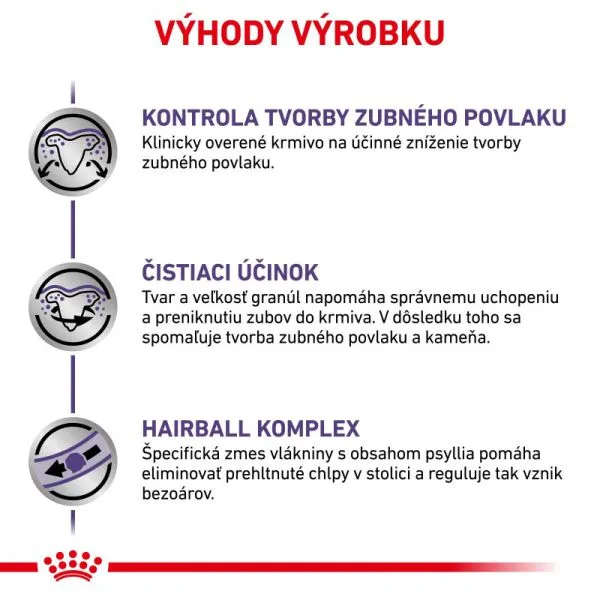 Hrana pentru pisici ROYAL CANIN® DENTAL a primit denumirea VOHC: "AJUTĂ LA REGULAREA COPERIȘULUI DENTAR", deoarece este o hrană dovedită clinic că reduce în mod eficient formarea plăcii dentare.
