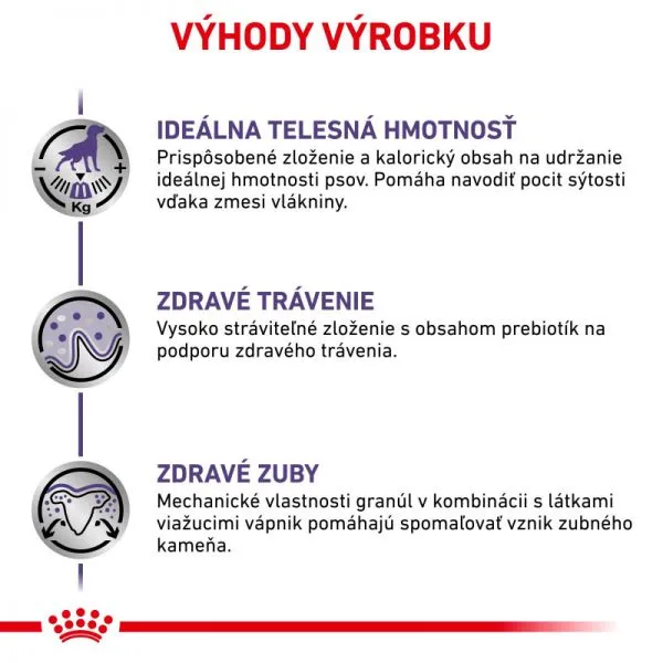 • GREUTATEA CORPORALĂ IDEALĂ - Formulă adaptată și conținut caloric pentru a menține greutatea ideală la câini. Contribuie la inducerea sațietății printr-un amestec de fibre.