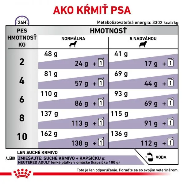Ca parte a gamei veterinare ROYAL CANIN®, este important ca acest produs să fie administrat animalului dumneavoastră de companie numai la recomandarea unui medic veterinar. Tranziția animalului dvs. de companie de la o dietă la alta trebuie să fie un proces lin și treptat, pe parcursul a 7-10 zile. Asigurați-vă că respectați cantitatea corectă, în special în cazul alimentației mixte.