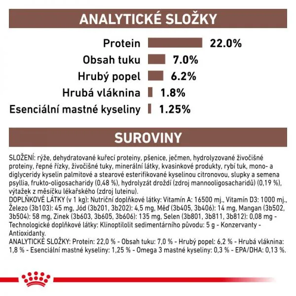 INGREDIENTE: orez, proteine de pasăre deshidratate, porumb, orz, proteine animale hidrolizate, resturi de zahăr, grăsimi animale, minerale, produse de drojdie, mono- și digliceride ale acizilor palmitic și stearic esterificate cu acid citric (48 %), ulei de pește, drojdie (sursă de mannooligozaharide) (0,19 %), făină de axamit. Componente foarte digerabile: 82,4 %.