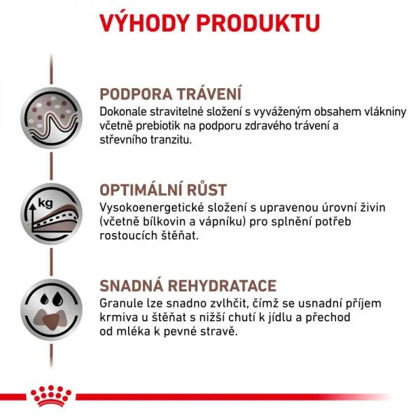 Copiii care suferă de indigestie pot fi foarte slabi și pot avea un apetit redus și/sau pot fi anxioși. Crochetele (dimensiune, textură și formă) sunt concepute pentru a fi ușor de rehidratat, ceea ce face mai ușor de mâncat pentru căței.