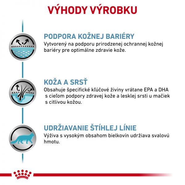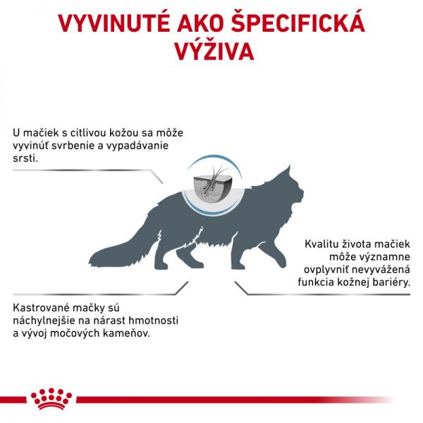 ROYAL CANIN® SKIN & COAT dry este o hrană dietetică completă pentru pisici, concepută pentru a susține funcția pielii în caz de dermatoze și căderea excesivă a părului. Mai multe detalii
