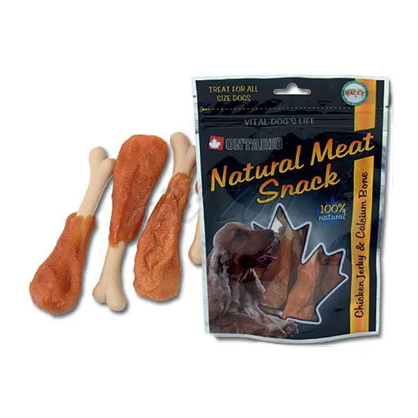 Recompensă pentru câini, hrană deliciu ONTARIO - Chicken Jerky and Calcium Bone – Deliciu sub formă de pulpă de pui cu os de calciu. Este un produs 100% natural.