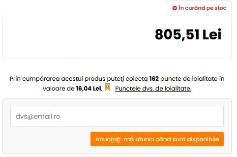 • Disponibil în curând = produsul este epuizat și temporar indisponibil. Dacă introduceți adresa dvs. de e-mail în căsuța de lângă produs, vă vom anunța când acesta va fi din nou în stoc.