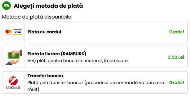 • Dacă alegeți să faceți plata cu numerar la livrare, veți plăti pentru bunuri atunci când le primiți. La plata prin ramburs percepem în plus o taxă de 3,5 lei